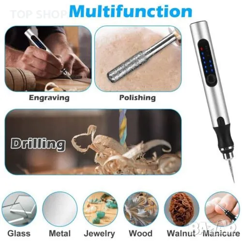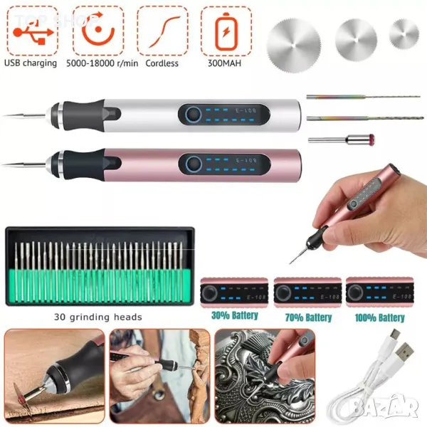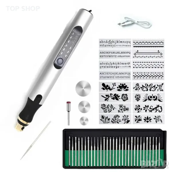 Пълни аксесоари: Нашият комплект писалка за гравиране на метал включва 30 шлифовъчни накрайника, 1 писалка и 1 кабел за зареждане, комплект шаблони- бекви, символи, форми и плетеници. Прост и лесен за научаване, особено подходящ за начинаещи. Направете ключодържатели, колиета „направи си сам“ или подаръци с нашите комплекти.