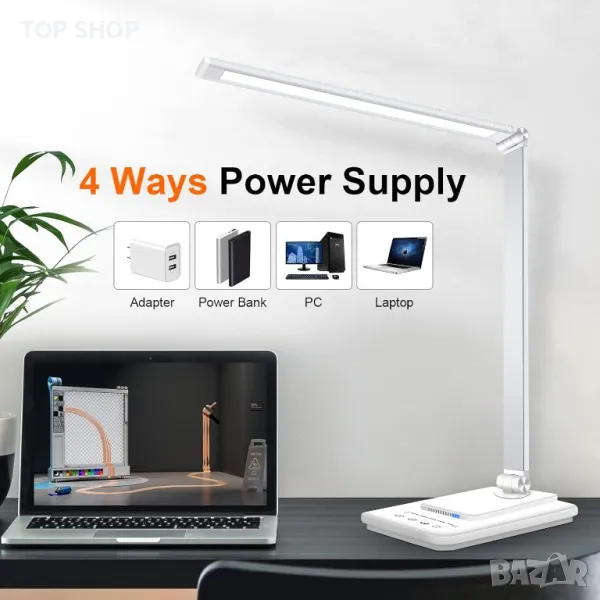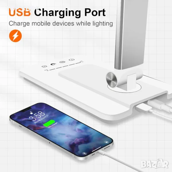 Широка гама от приложения: LED настолната лампа предлага 5 нива на яркост и 5 режима на осветяване, за да осигури перфектни нива на осветеност за работа, перално помещение, четене и палатка. Може да се използва и като зарядна станция за мобилни устройства. Може да се използва и като лампа за грим, нощна лампа и др