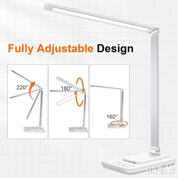 【Гъвкаво и сгъваемо рамо】 Хвърлете светлина върху терена, както желаете, с гъвкавото рамо на 180 градуса и основната ос на 90 градуса. Можете да изберете най-добрия ъгъл на осветяване, който да отговаря на вашите различни нужди. Благодарение на своята здрава и стабилна основа, лампата за четене запазва своята позиция и ъгъл, като същевременно осигурява най-добрата станция за зареждане на смартфон, таблет или плейър