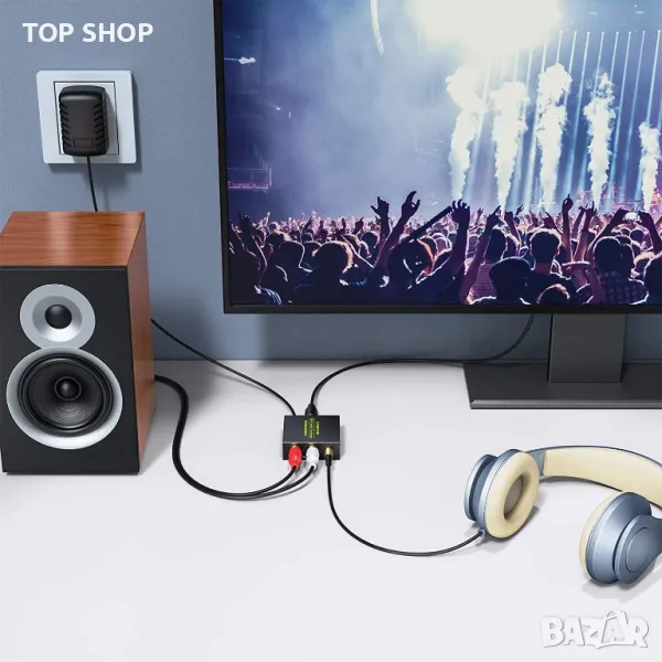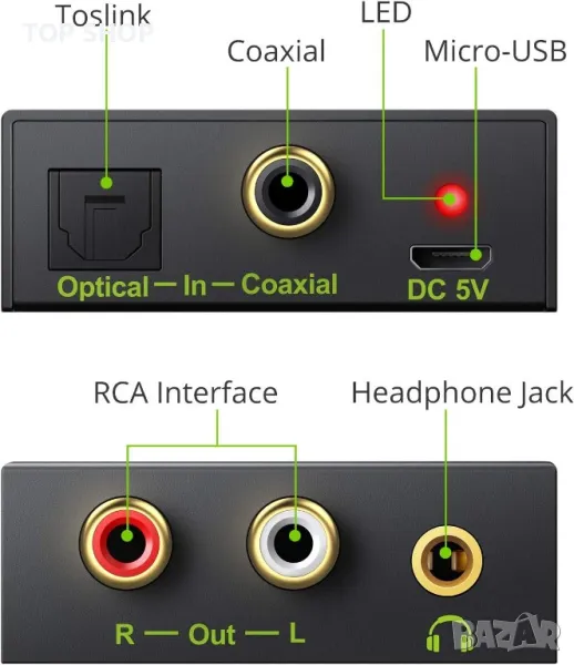 Преобразува коаксиални или цифрови аудио сигнали в аналогово L/R аудио и достъпно за свързване към външно устройство като усилвател чрез стандартни RCA конектори