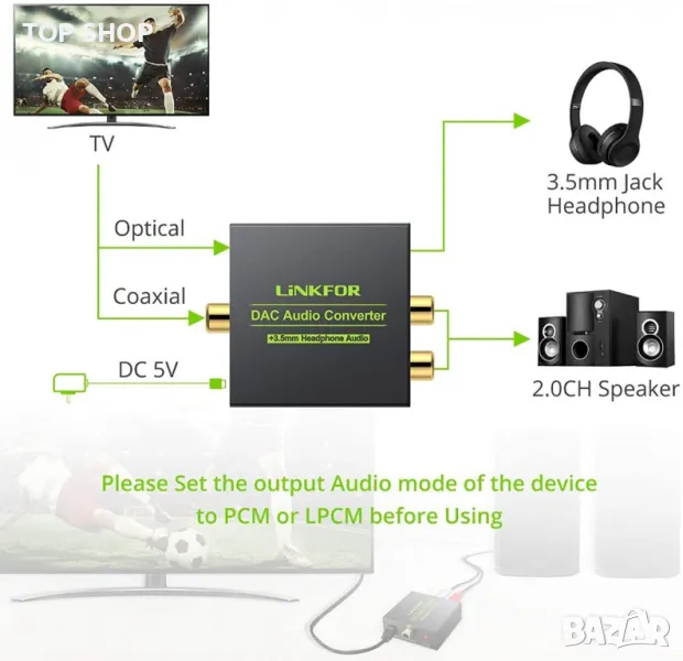 Plug and Play Няма нужда от инсталиране на драйвери, лесен за инсталиране и работа; Също така, компактен размер, лесен за пренасяне, идеален за вкъщи или пътуване до работното място (Забележка: Не е съвместим с 5.1-канален професионален аудио сигнал като Dolby AC3, DTS, моля за PCM аудио изходен режим или устройството към LPCM преди да използвате)