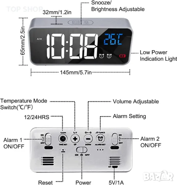 LED цифров будилник е проектиран с двойни аларми. Позволява ви да зададете два комплекта отделни будилници, ако имате различни графици със семействата си. Внимателно докоснете горната част на будилника. Можете лесно да допълните 5 минути сън. Освен това този цифров часовник ще бъде добър спътник на малките деца, когато се научат да спят сами в собствената си спалня. Яркостта е разделена на 5 нива. Можете лесно да превключите яркостта на по-ярко ниво през деня, докато по-слабо през нощта, без да безпокоите семействата си.