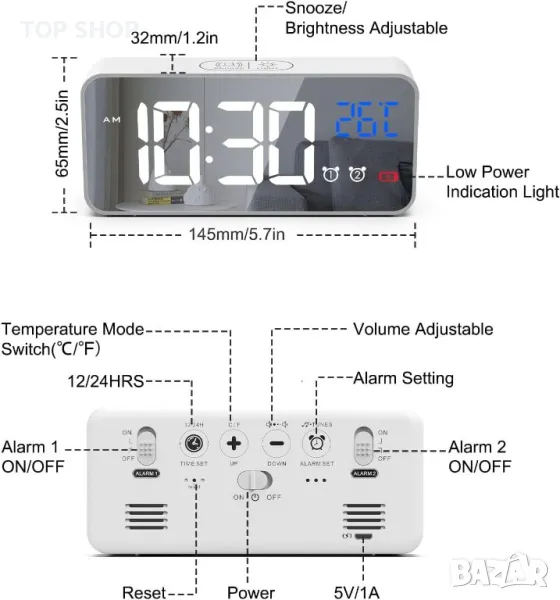 - [Двойна аларма с отлагане] - Можете да зададете две отделни аларми, ако спите много или имате различен график от семействата си. Внимателно докоснете горната част на будилника, за да получите допълнителни 5 минути сън (дрямка).