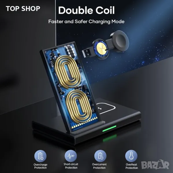 Безжична зарядна станция 3 в 1: устройство, което може да зарежда всички джаджи на едно място. Безжичната зарядна станция е напълно съвместима с мобилни телефони, поддържащи Qi, iWatch и AirPods. Приложимо за iPhone 14/14 Pro/14 Pro Max/13 Pro/13 Pro Max/12/12 Pro Max/11 Pro/11 Pro Max/X/Xs/Xs Max/8/8 Plus Samsung S9/S8/Note8/ S7 Edge, гледайте серия 7/SE/6/5/4/3