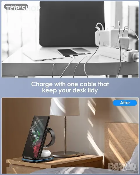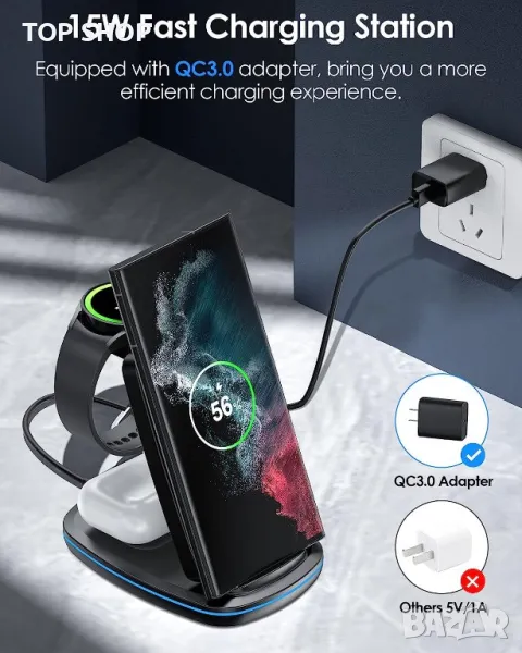 【3-в-1 сгъваемо бързо зарядно устройство с QC адаптер】 Безжична станция за зареждане. Тази станция за зареждане 3 в 1 ви позволява да зареждате няколко устройства едновременно на едно място, спретнато и организирано. Зареждайте своя iPhone/Apple Watch/Airpods едновременно, също и като държач за телефон. Съвместим и с телефони Samsung / Huawei. Стойката за зареждане се захранва от включения адаптер QC 3.0. Безжичното зарядно зарежда напълно вашия телефон за около 3 часа.