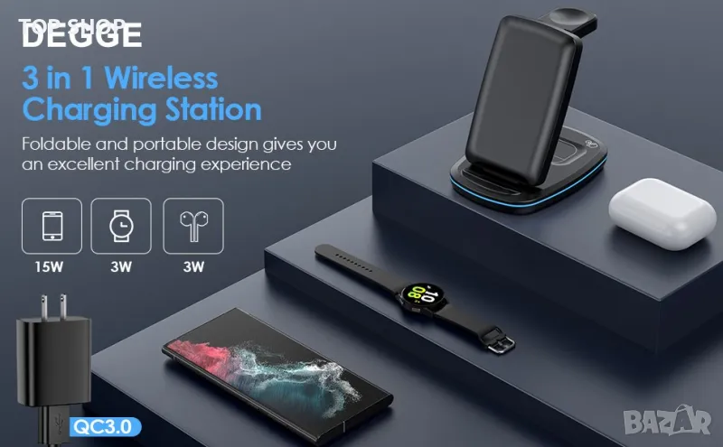 Безжично зарядно устройство 3 в 1, сгъваема станция за бързо зареждане,