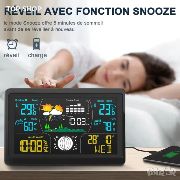 Функция 5 в 1. Тази метеорологична станция може не само да предсказва бъдещи метеорологични условия, вътрешна/външна температура и влажност, но също така има фази на луната, календар, часовник и аларма с функция за дрямка, което прави живота ви по-редовен.