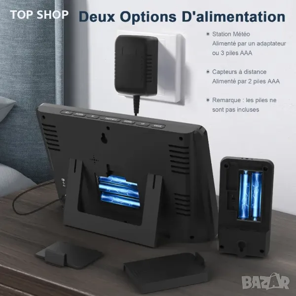 Две опции за захранване. Нашата метеорологична станция се захранва основно от захранващия адаптер (включен) или 3 AAA батерии (не са включени). Със захранващия адаптер екранът е винаги включен и 3 нива на яркост се регулират; когато работи на батерия, екранът се включва след прибл. 10 секунди автоматично изключване за пестене на енергия.