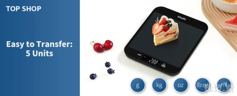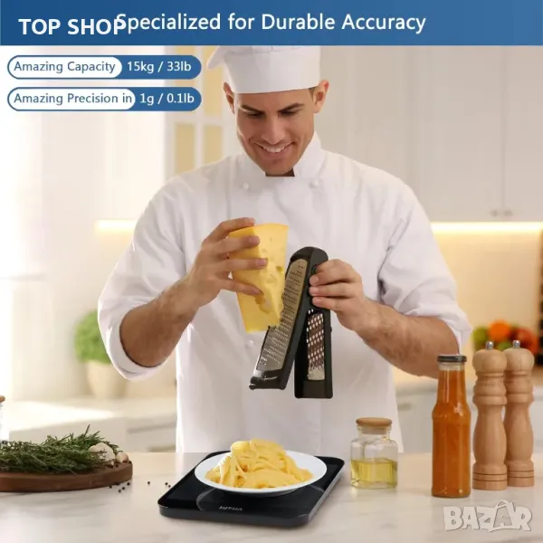 Кухненската везна има удивителен капацитет до 33lbs / 15kg и минимално тегло 3g, измерено в 1g точна стъпка, показване на резултатите от измерването в g,kg,oz и lb:oz.