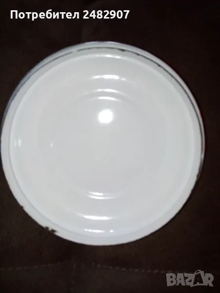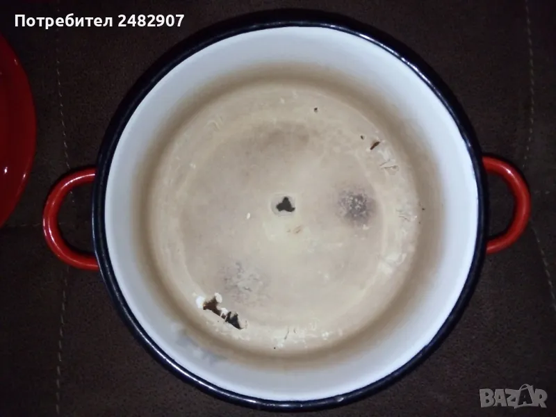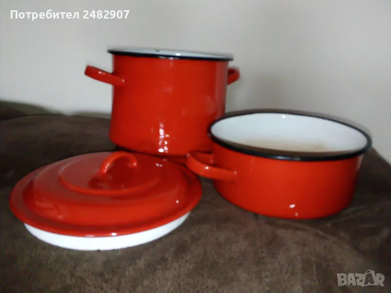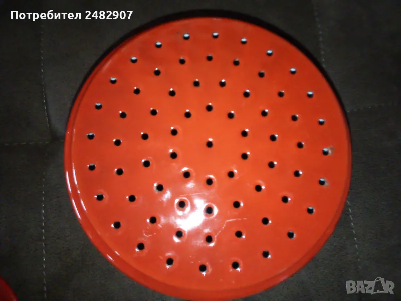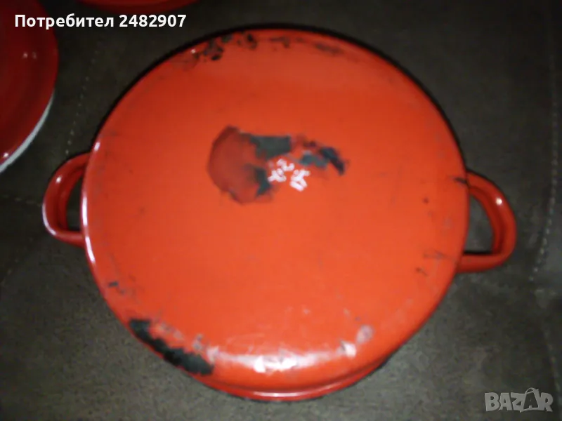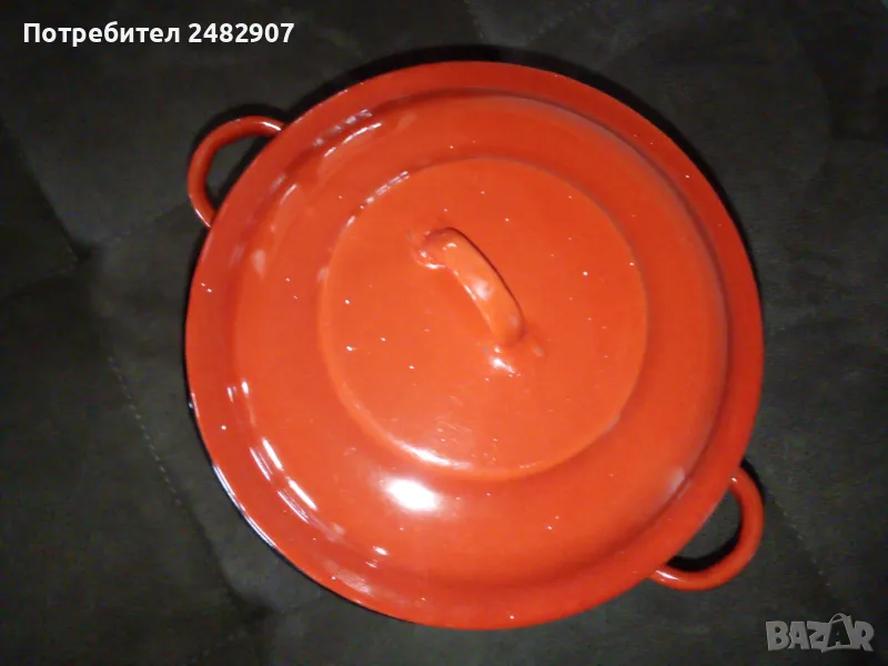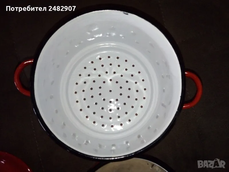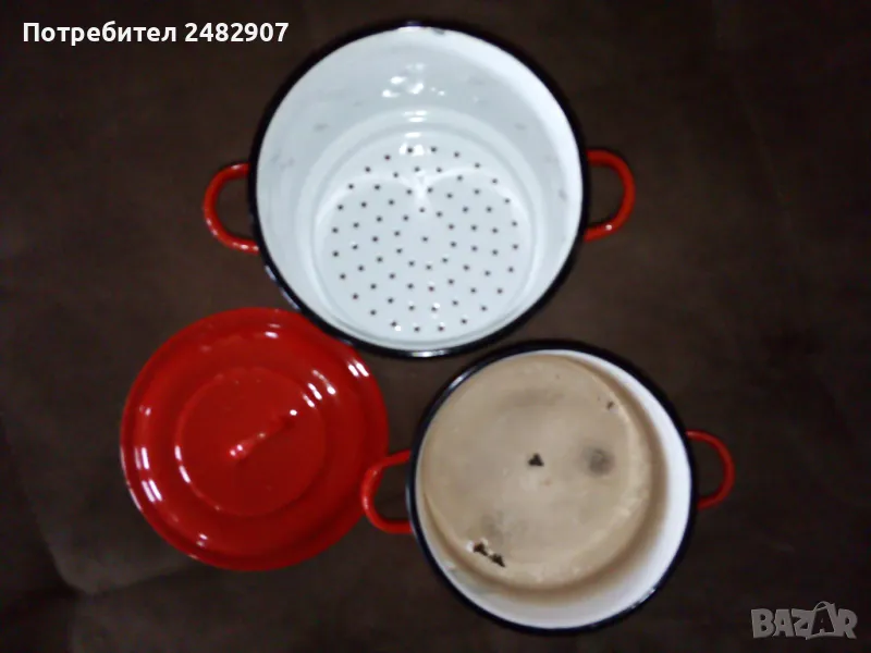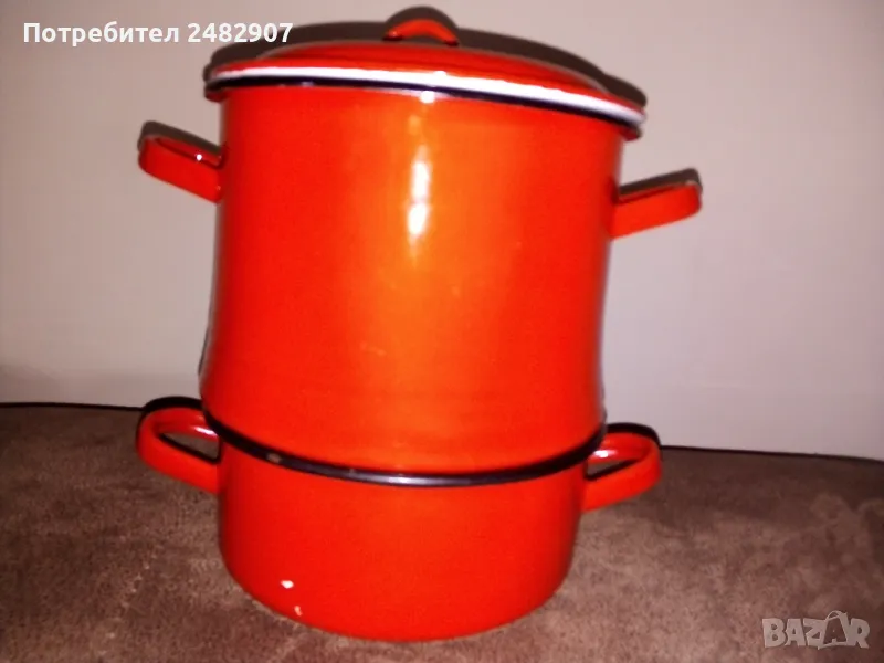 Червена емайлирана ретро тенджера за готвене на пара, състояща се от тенджера, съд с дупки за готвене на пара и капак. Диаметър - 18 см, височина на тенджерата - 7 см, височина на приставката за пара - 13 см, обща височина -21 см. Запазена, с нормални следи от използване и забележки, видими от снимките. Ползвана е само долната част.