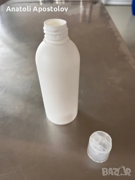 Бутилка HDPE (полиетилен висока плътност) 200 ml вместимост, гърловина 24/410 в кашони. Налично количество 5000 броя, цена 0,30лв. за брой. + 0,20лв за капачка.