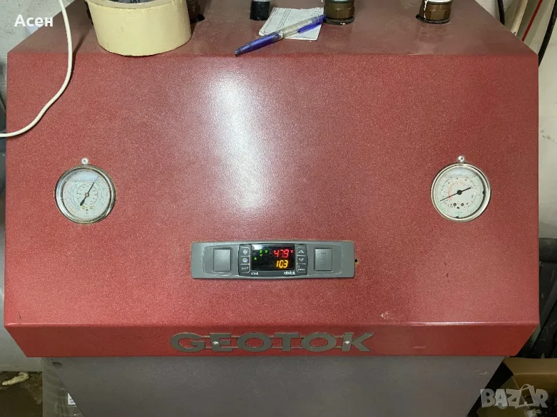 Продавам термопомпа вода -вода Геоток -32 киловата , трифазна с два компресора. Единия компресор има консумация 4 киловата като я преобразува в 16 киловата отоплителна мощност. Компресорите са Daikin. Може да работи и само единия компресор спрямо нуждите. Намира се в с. Алдомировци, София, в момента е свързана и работи.