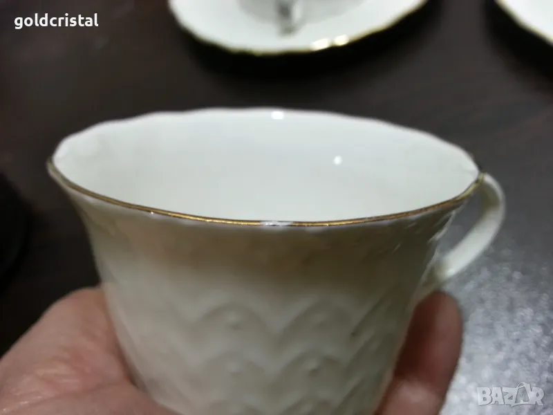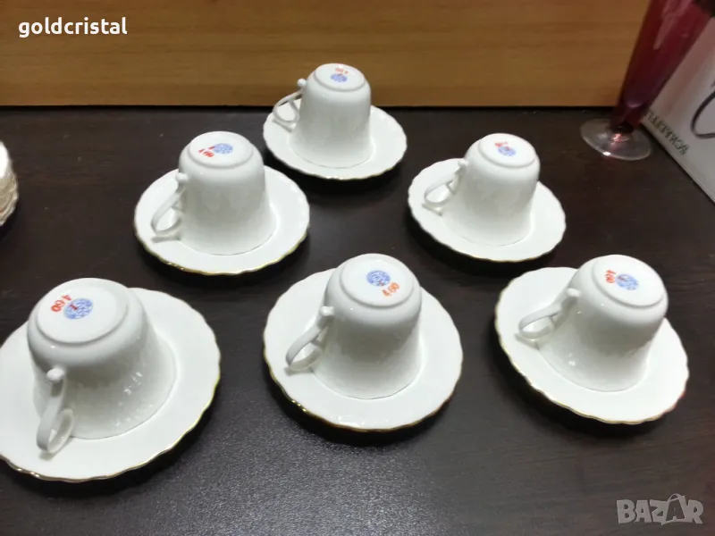 Стар български костен порцелан Бононя чашки за кафе с чинийки неизползвани все още с воден печат плътен златен кант една чашка има микро прекъсване на канта сервиз комплект сет лот ретро арт декор винтидж колекция стари старинни антикварни предмети обзавеждане за дома и семейството подходящи за подарък за ценители и колекционери