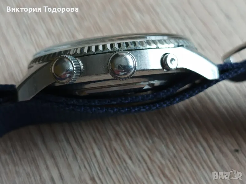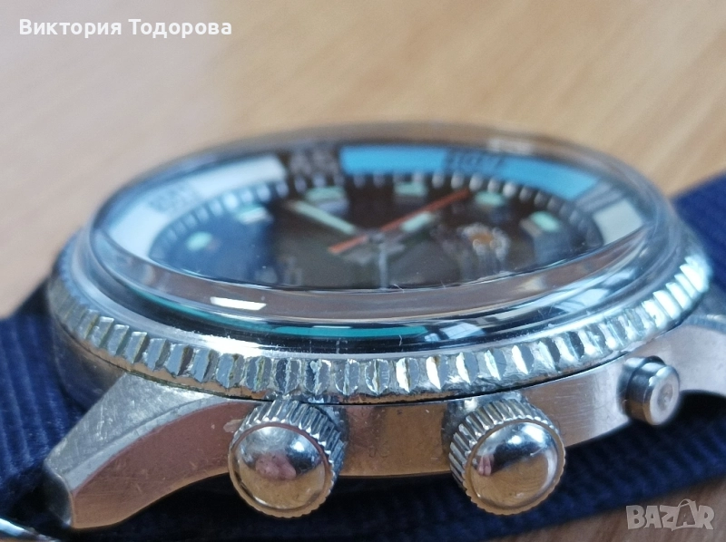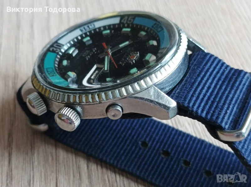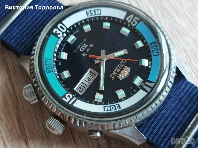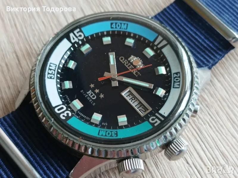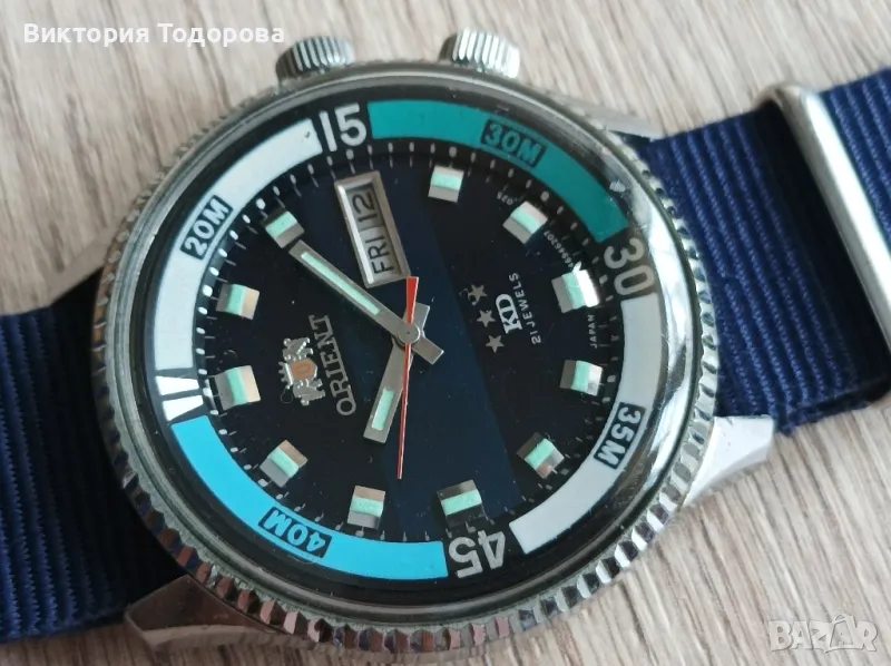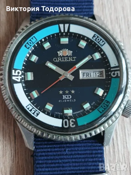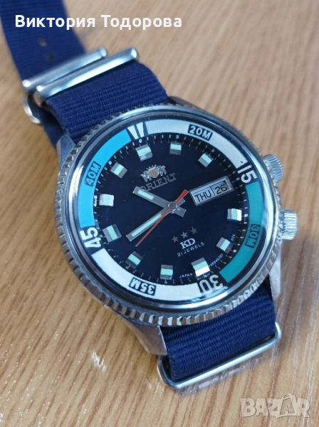 Здравейте! Предлагам красив и работещ ретро часовник Orient King Diver. Стъклото е ново оригинално с вътрешен ръб държащ вътрешния въртящ се безел. С него безелът се върти без луфтове във всяко положение на часовника. Истински късмет е да намериш такова оригинално стъкло. Стрелките и циферблата са в много добро състояние. По касата има косъмчета, но няма следи от сериозни наранявания. Всичко по часовникът работи.