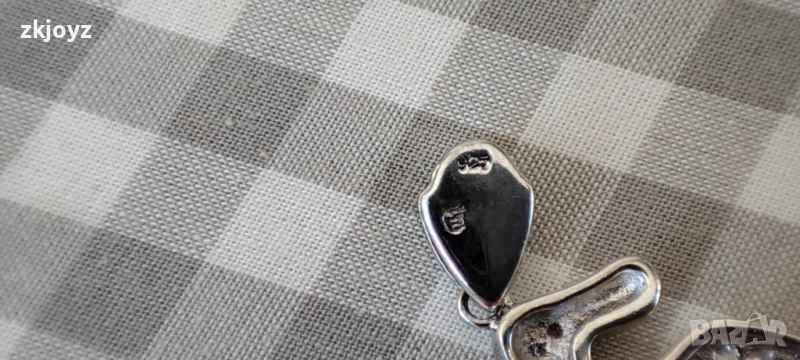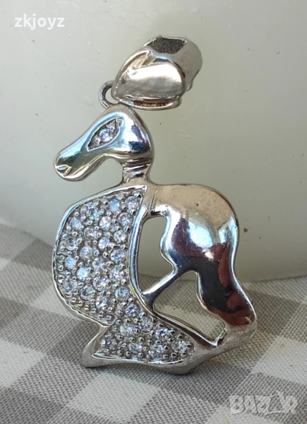 Висулка с форма на животно, изработена от покрито с родий сребро, проба 925 ( маркиран на гърба), украсена с циркони, тегло 8 грама, размери 4.30 см х 2.40 сантиметра.