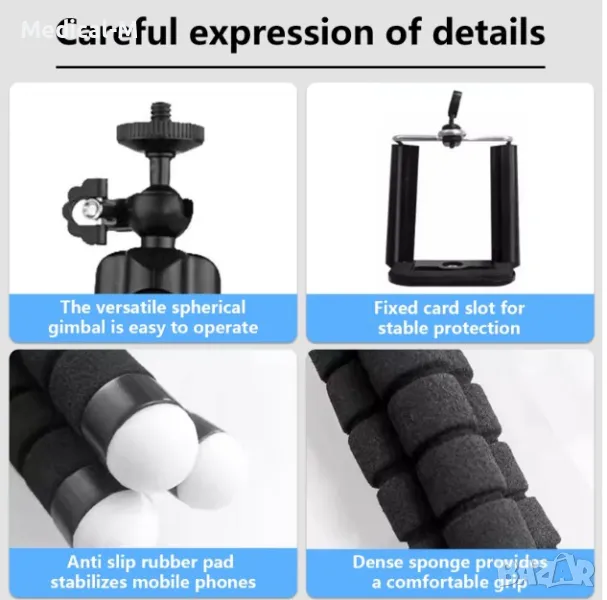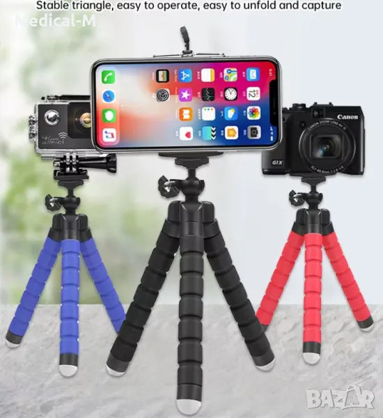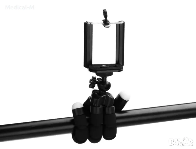Този малък гъвкав трипод е идеален за всички любители на снимките и видео клиповете с телефон. Краката му се огъват, за да може да се закрепя лесно на различни места като кормило на велосипед, клони, парапети и другаде където пожелаете. Можете да го позиционирате на места, където е невъзможно да се използва обикновен статив. Ще държи телефона ви здраво закрепен към кормилото на вашият велосипеда докато карате в парка или в планината. С него ще можете да правите снимки и видео клипове под всеки ъгъл дори в движение. Скобата му за телефон се върти на 360 градуса и е подходяща както за портретни, така и за пейзажни снимки. Благодарение на материала, от който са изработени подложките на краката му, той стои стабилно на всякакви повърхности. Краката му са изработени от гъвкав метал и са покрити с издръжлива пяна, благодарение на която се закрепя здраво, ако го увиете около нещо.