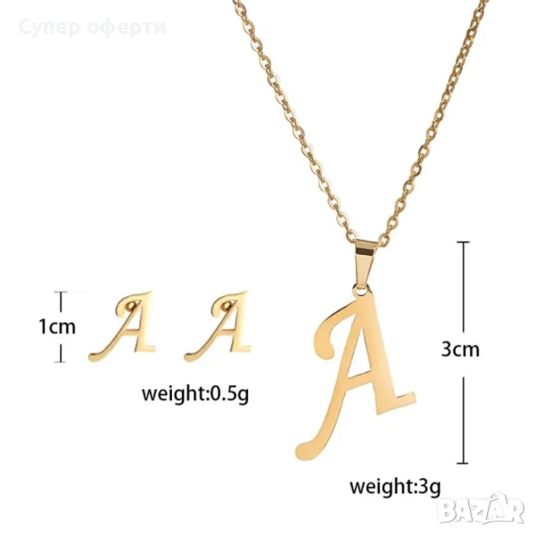 Фино и елегантно дамско колие, направено от неръждаема стомана и златно покритие. Предлага се с висулка буква от английската азбука, както и 2 по-малки букви тип щипки. Налични са със всички 26 букви от английската азбука.