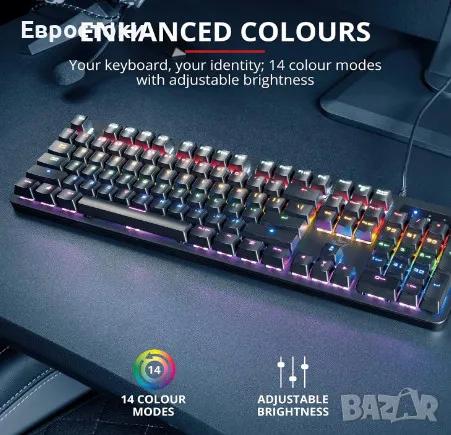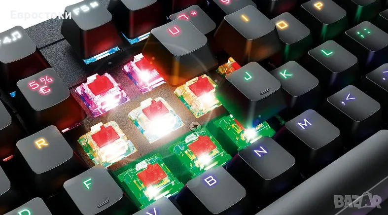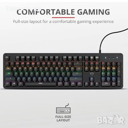 Trust GXT 1863 Thaz е механична игрална клавиатура в пълен размер с пълна QWERTY подредба и цифрова клавиатура.