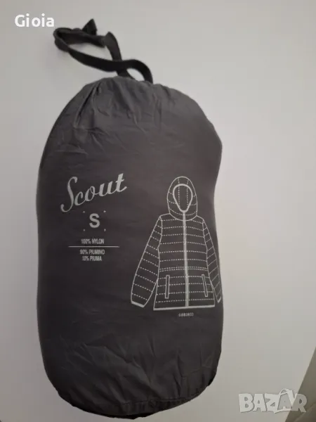 Scout преносимо пухено тънко яке. Против вятър и дъжд. Може да се вталява в кръста. Размер xs/s, дължина 57, гръдна обиколка 37, рамене 33, дължина на ръкав 57.Цвета е черен, стои по тялото. Без забележки.