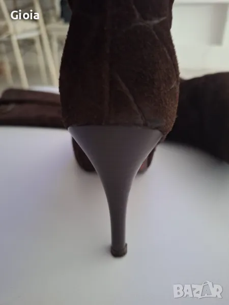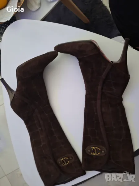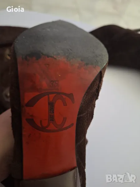 Roberto Cavalli оригинални ботуши от естествена кожа и велур. Тъмно кафяв цвят, с лого на марката от външната страна и цип от вътрешната за по-лесно обуване. Подметката е за смяна, цената е крайна.
