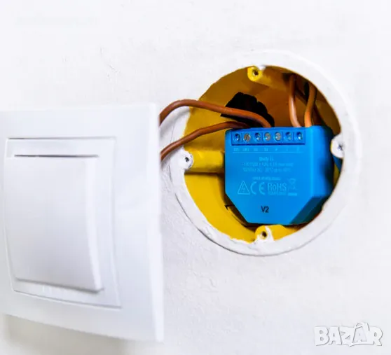 Shelly 1L управлява една електрическа верига с консумация до 1kW. Подходящо е за инсталация в стандартна стенна конзола.