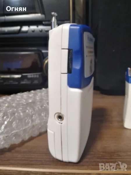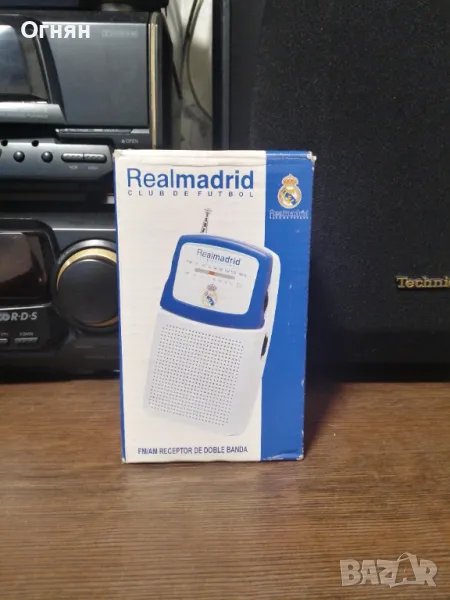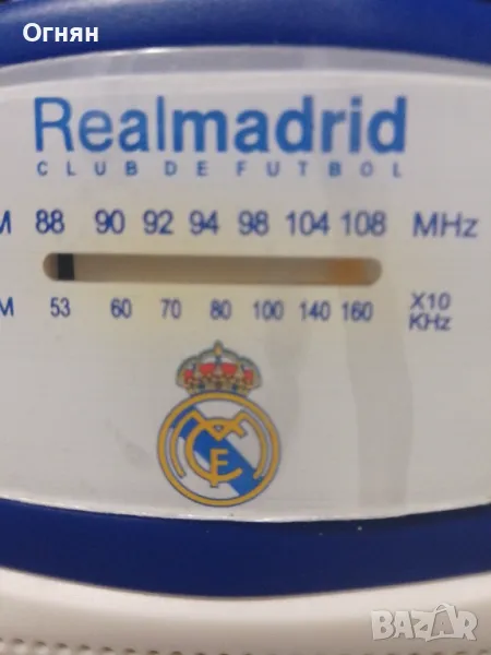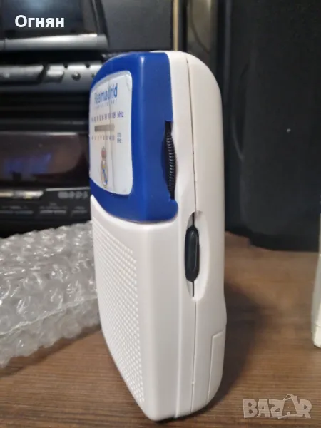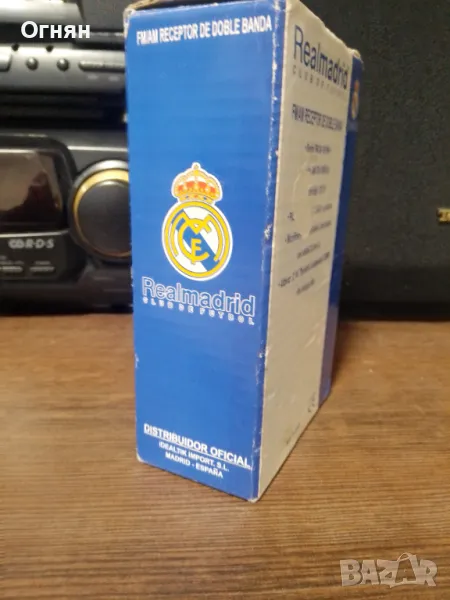 Ново радио с логото на Реал Мадрид, закупено от магазинът за фенове на стадиона там.Стои стикерът на екранчето,кутията е здрава и има нови батерии.