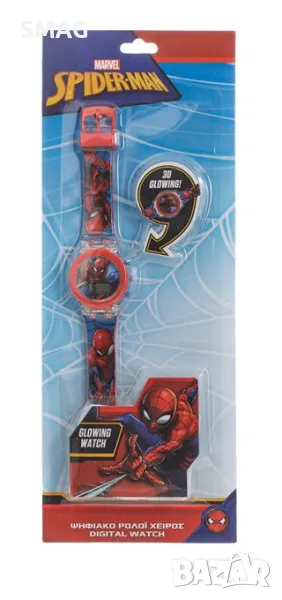 Дигитален ръчен часовник за момчета с червена каишка, шарка на Спайдърмен и цветен пръстен на циферблата. Бутон активира цветната мигаща светлина и автоматично се изключва след известно време. Има час, дата и мека каишка. Работи с 2 батерии тип AG10 (включени).