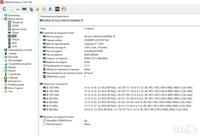 Памет - 4 GB DDR4-2133 DDR4 SDRAM (SK hynix HMA451U6AFR8N-TF)