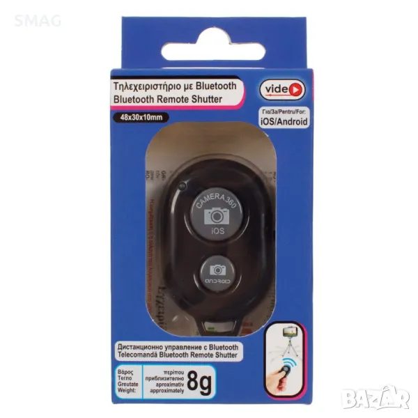 Дистанционно управление в черен цвят с bluetooth (версия 3.0) и интегрирано приложение за камера за разстояние до 10м. Съвместим с 4.2.2 OS и iOS 6.0 или по-нова версия. Спецификации: Затвор модел I. Работи с 1 батерия тип CR2032 (включена).