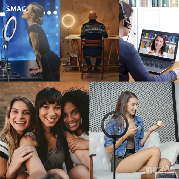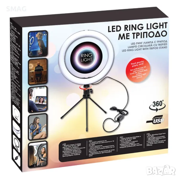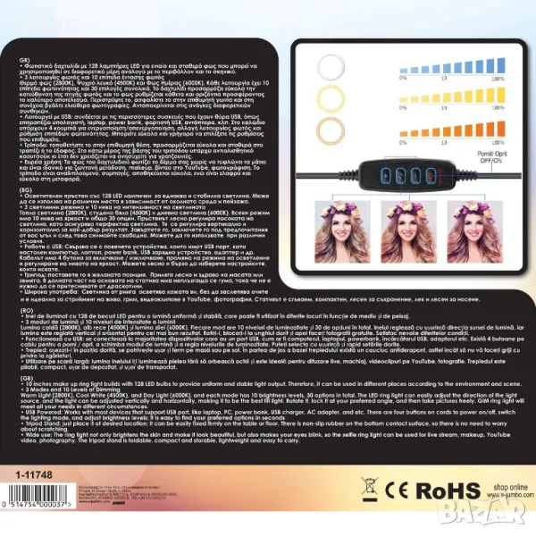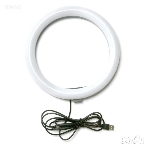 Осветителен пръстен със 128 led лампи за единична и стабилна светлина, която може да се използва на различни места в зависимост от средата и обстановката. Има 3 светлинни режима и 10 нива на интензитет на светлината (топла светлина-2800K, студена бяла светлина-4500K и дневна светлина-6000K). Всеки режим има 10 нива на яркост и общо 30 опции. Пръстенът лесно регулира посоката на източника на светлина. Тя се регулира вертикално и хоризонтално, предлагайки най-добър ефект. Завъртете го, заключете го под желания ъгъл и след това свободно правете снимки. Той отговаря на нуждите на различни условия. Работи с USB кабел и има статив с височина до 24см за поставяне в желаната позиция. Светлината му осветява кожата, без да заслепява очите и е идеален за предаване на живо, грим, видеоклипове в YouTube или фотография. Има диаметър 26 см и може да се върти на 360º.