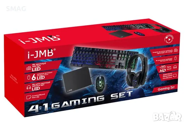 Комплект за игри с кабелна клавиатура със 7 LED цвята, мишка с ергономичен дизайн, 4 клавиша и DPI 2400 колело и 7 LED цвята, 2x3.5mm +USB слушалки с 20 Hz-20 KHz отхвърляне на честотата и 360º HD звук и подложка за мишка с фиксирани ръбове 23.5 х20х0,2 см. Включете клавиатура, мишка и слушалки в USB порта и те ще се свържат автоматично.