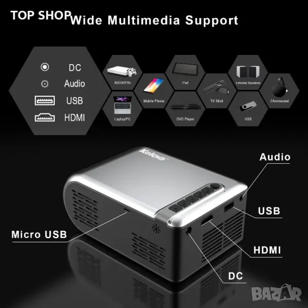 【Съвместимост с мултимедия】 Този мини проектор е оборудван с USB и HDMI порт, микро USB порт, порт за слушалки и порт за захранване. Съвместим е с Amazon fire TV stick, USB, DVD плейър, лаптоп, macBook, iOS/Android телефон/таблети, слушалки, външни високоговорители, PS4 и др.