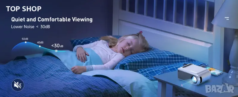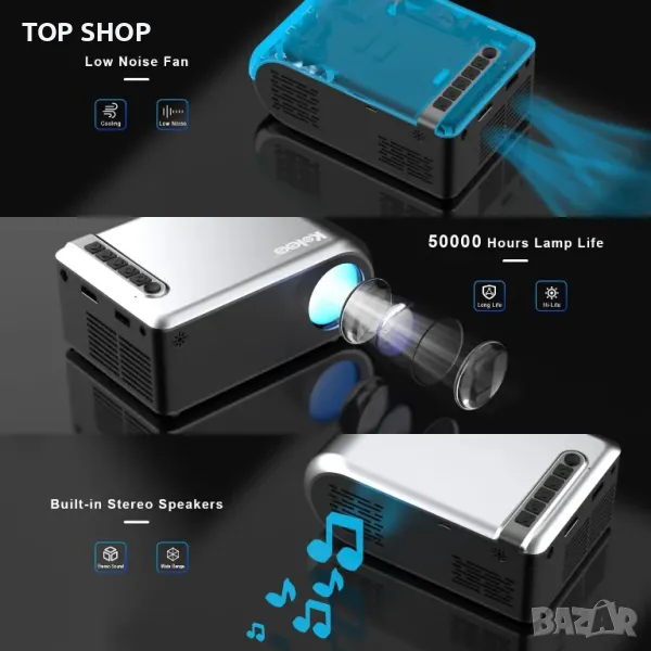 【HiFi стерео високоговорител】 Този проектор издава ясен, ясен и силен звук със своя вграден високоговорител 3 W/8 ома за използване на закрито/външно. И можете също да го свържете към външен високоговорител. Функцията за ефективно разсейване на топлината ефективно намалява шума от вентилатора на проектора. Освен това този проектор поддържа различни методи за инсталиране, можете да го поставите на статив за лесно преместване или да го инсталирате под тавана.