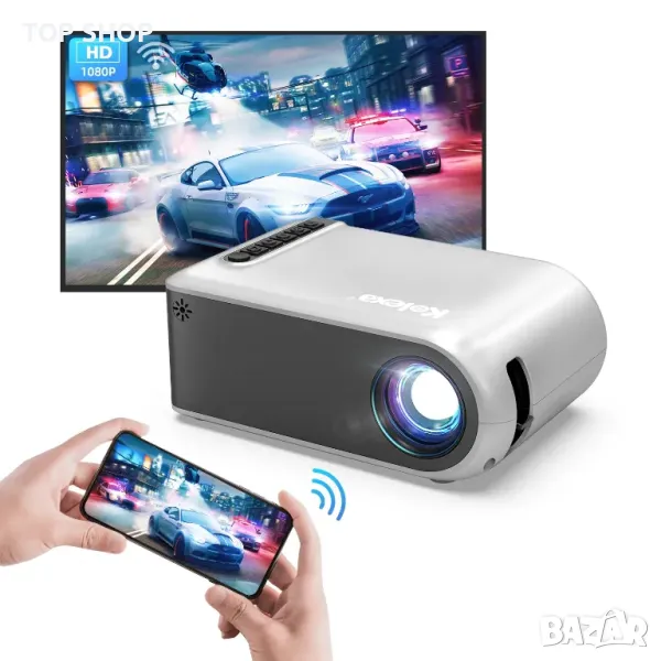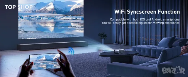【Функция WiFi Syncscreen】Проекторът на телефона използва технология за WiFi връзка, съвместима както със смартфон с IOS, така и с Android. Просто свържете видео проектора към същата wifi с вашето устройство, след това включете функцията за дублиране на екрана за синхронизиране за проектора и вашето устройство, можете по-лесно да получите стабилно изживяване при гледане на голям екран.