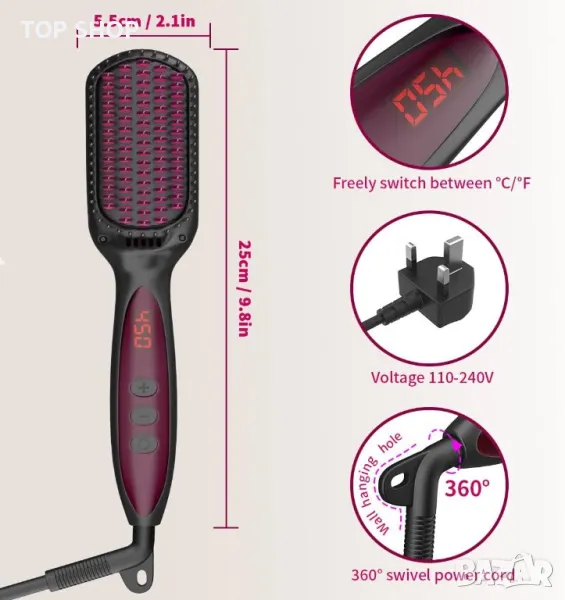 【Безопасността винаги е нашият първи приоритет за вас】Четка за изправяне на коса. Керамичното покритие предпазва косата ви от прекалено оформяне с равномерно разпределение на топлината, която прониква бързо в косата отвътре навън за по-малко увреждане. 60 W мощност за използване на преса за коса и преса за къдрици, против изгаряне. 110V-220V, 50-60Hz.