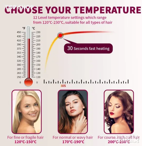 【12 температури на нагряване ви помагат да направите елегантна прическа】Спестяване на вашето време сутрин, 30-те бързо нагряване и лесна работа помагат на офис дамата да спести много повече време сутрин за оформяне на прическа. Изправете и навийте косата си сами под всякакъв ъгъл с въртящ се на 360 градуса 2M захранващ кабел. 12 настройки за топлина, които предлагат различни изисквания.
