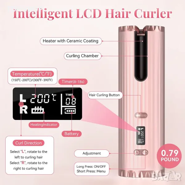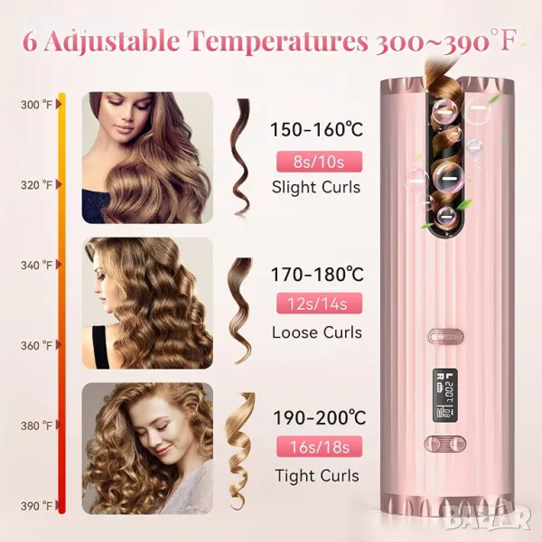【6 температура и таймер】-- Има 6 температурни опции с по-широк диапазон от 150 ℃ до 200 ℃; има и 6 настройки на таймера (8-18 секунди). Всичко това се показва на малък LCD екран. Позволява ви да изберете подходящия момент за създаване на различни прически от вълни до стегнати къдрици. Насладете се на безкрайните възможности за стилизиране.