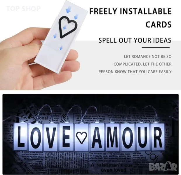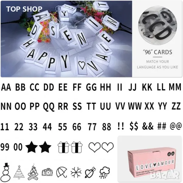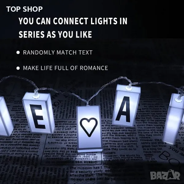ABCDEFGHIJKLMNOPQRSTUVWXYZ & LED светлини с азбучен знак, като например за произволна комбинация в I LOVE U, HOME, MARRY ME, U&M, JOY,