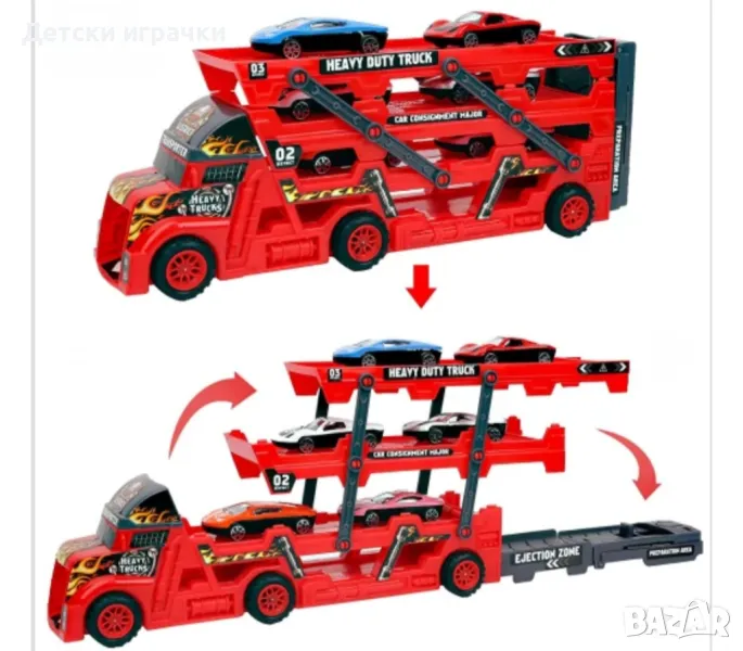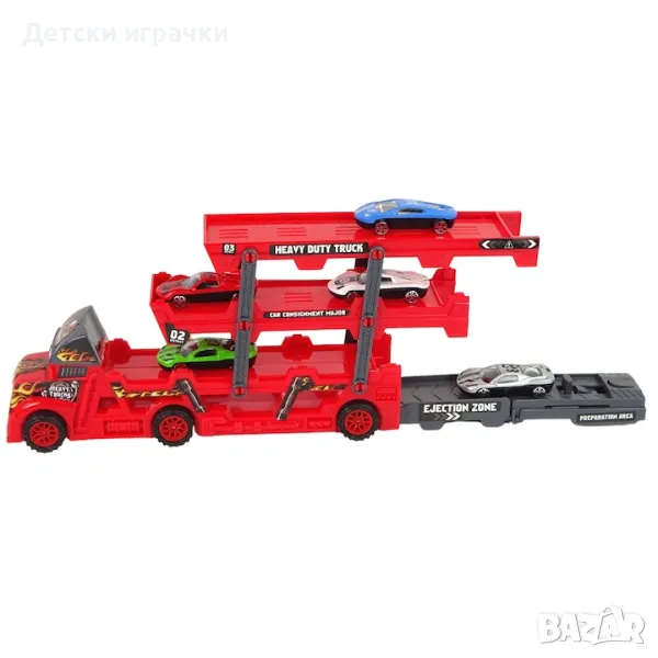 Камион автовоз играчка, който пренася и разтоварва колички през кабината си - чудесен подарък за всяко момче.