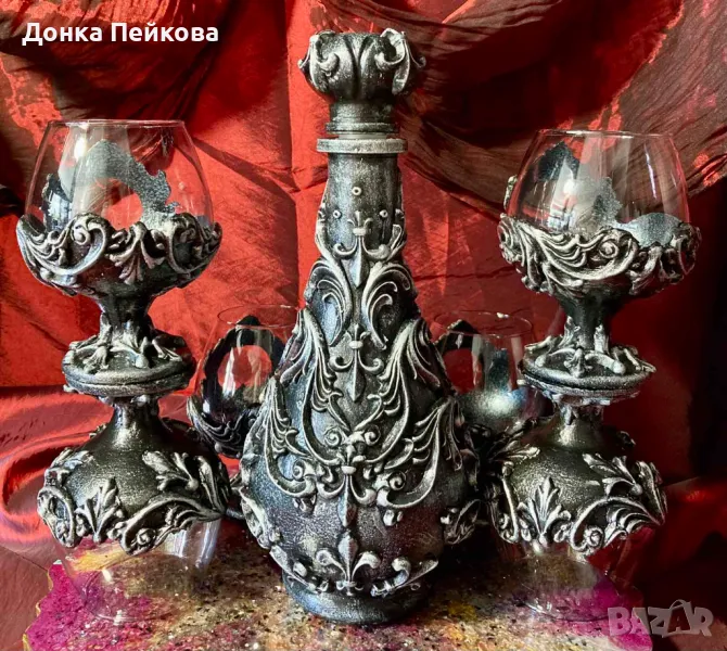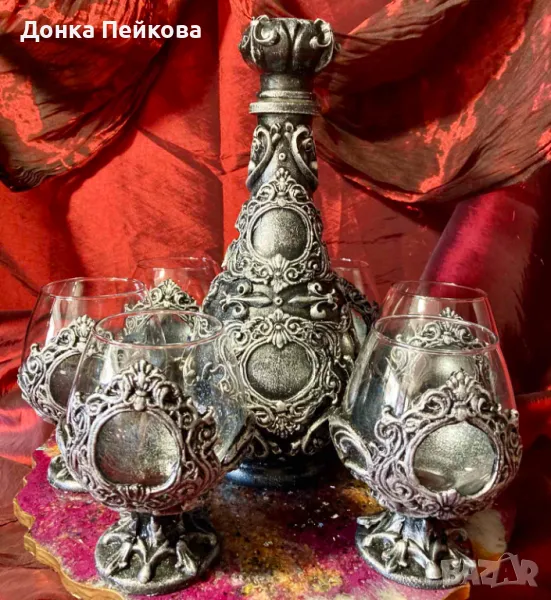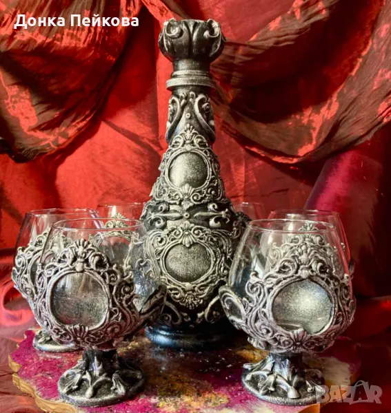 с имитация на сребро- един впечатляващ и нетовторим подарък за годишнина, за Рожден Ден, за абитуриентска, за сватба, за юбилей, подарък с който гарантирано ще впечатлите всички! Комплекта е единствен и няма да има друг такъв, което го прави уникален. Съдържа 6 чаши и гарафа. За изработката са използвани безвредни и водоустойчиви материали. Може да се мие с мека гъбичка и без накисване. Да не се мие в съдомиялна машина и да не се мие с гореща вода.