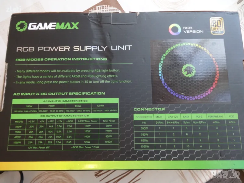 Продава се: Ново геймърско компютърно пълно модулно захранване GameMax RGB-1050 Pro 1050W