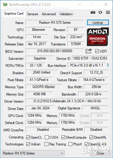 Видеокарта: Sapphire Pulse RX570, 4GB.