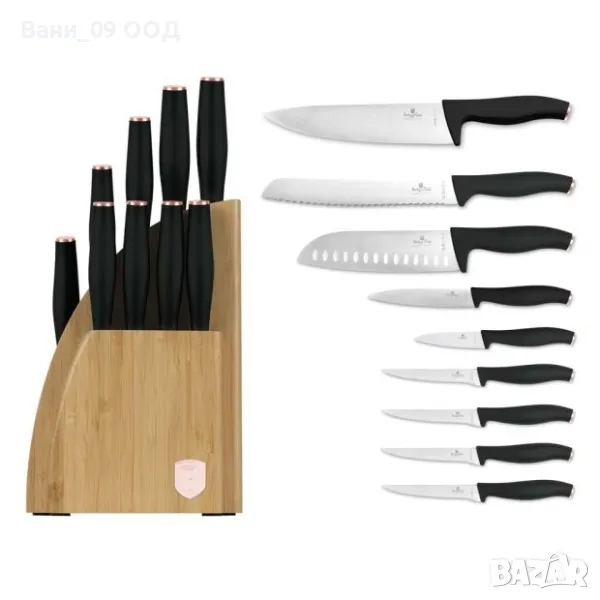 Луксозен комплект ножове с елегантни черни дръжки, бамбукова стойка и детайли в цвят розово злато