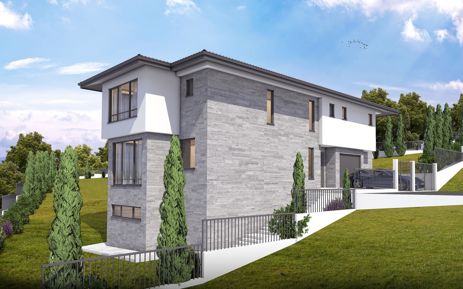 Вертикална планировка- бетонни огради;подпорни стени по двора;площадки и стъпала с бетон около къщата .Засипване и заравняване на двора с хумус.Направа на автоматична поливна система и засаждане на райграс.