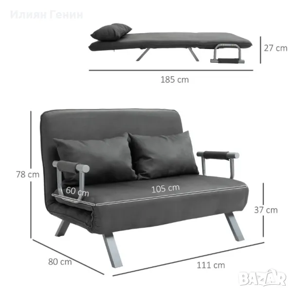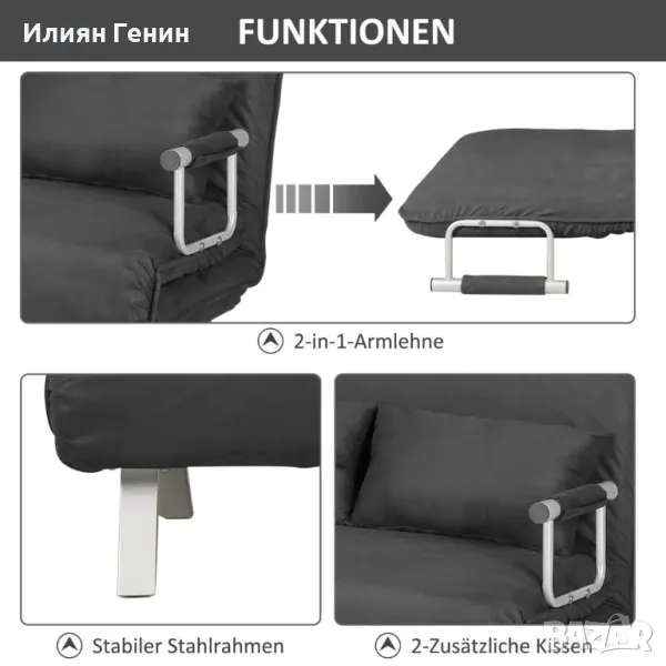 Разтегателен диван с регулируема облегалка, Възглавница, Диван с функция за сън Velvet Look, Подлакътник, Сив - 450.00лв.