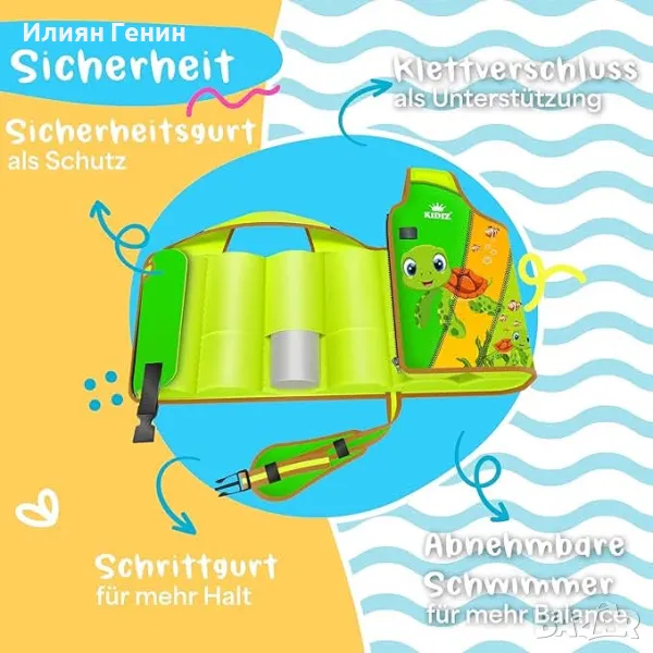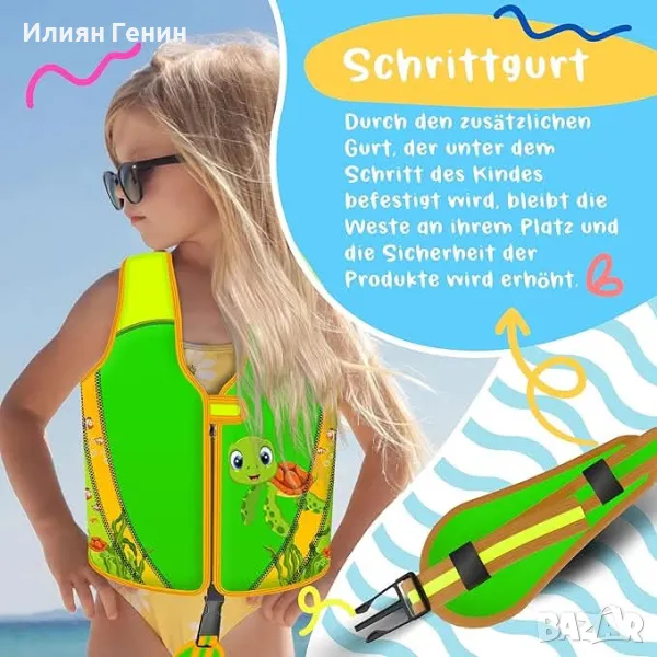 Лесен за използване: Специална характеристика на спасителната жилетка KIDIZ е лентата за чатала, която се закрепва под чатала на детето и за доп. Стоп осигурява. Тази лента предотвратява повдигането на жилетката дори при интензивно движение във водата. Това означава, че жилетката винаги остава в оптимална позиция, което значително повишава безопасността и комфорта за вашето дете.