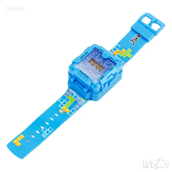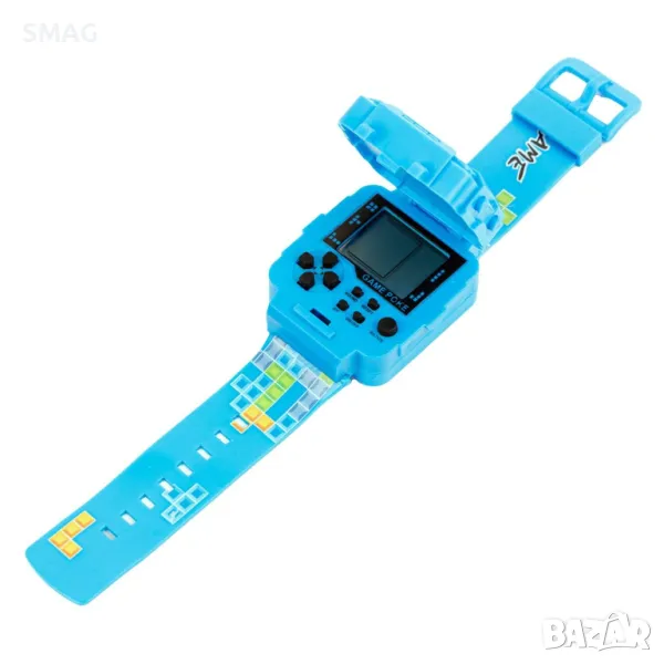 Електронен часовник - игрова конзола в син цвят. Има вградени 26 ретро играчки, а капакът се отваря, затваря и маха.