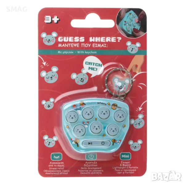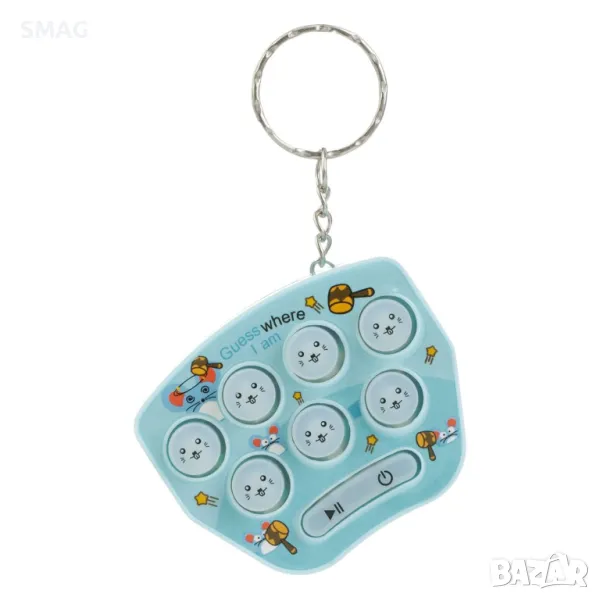 Конзола "Познай къде съм" в светло синьо с дизайн на мишка и ключодържател. По време на играта светлините на бутоните ще светят, показвайки какво да натиснете. Той е лек и преносим, помага ви да облекчите стреса, както и да развиете умения. Работи с 3 батерии LR44 (включени и сменяеми).