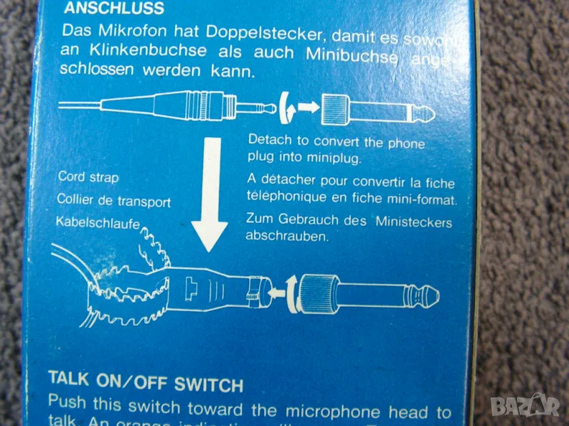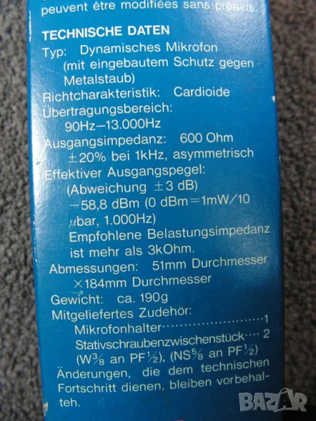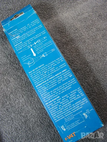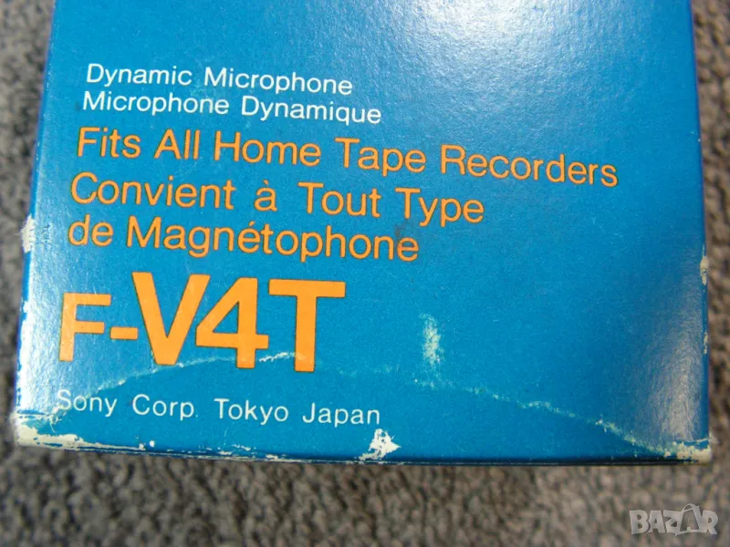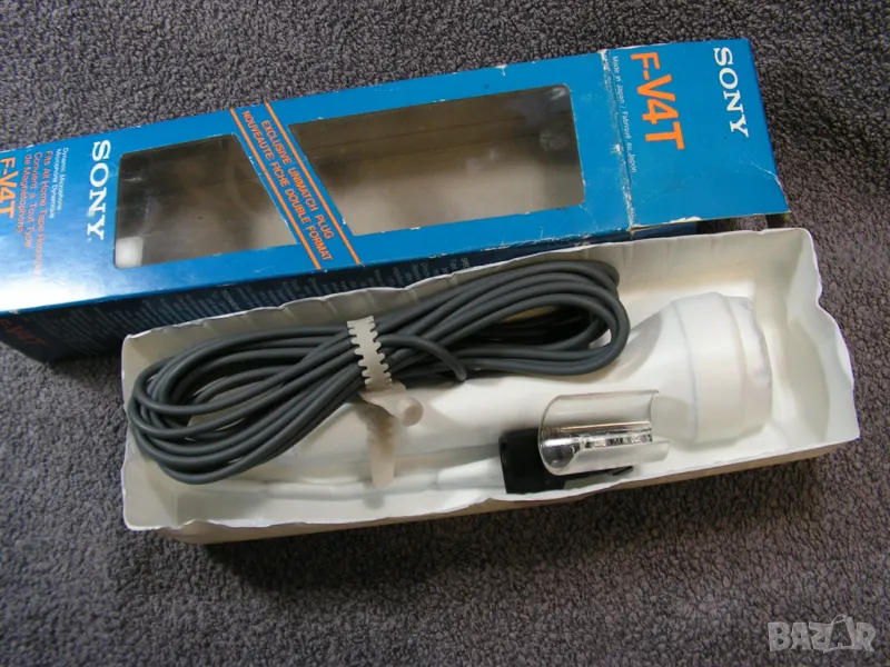 Предлагам един оригинален японски динамичен, моно микрофон на Sony , модел: FV4T. В оригиналната си опаковка е. Не е ваден от нея.В друга моя обява тук в Базар предлагам и употребявани микрофони от този модел. Микрофонът е с 5 метров кабел завършващ на моно жак 3,5 мм. В комплекта има микрофонен държач SAD 23-25 и адаптер жак 3,5 на 6,5 мм, който се свързва с жака посредством резба. Основния цвят на микрофона и кабела е сив. Всички технически данни са отпечатани на опаковката.
