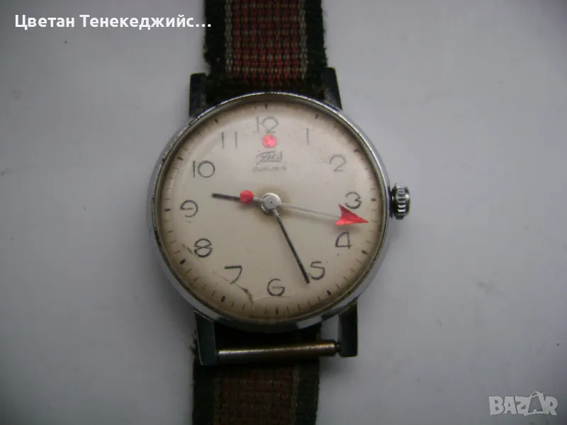 1.Руски механичен часовник Zaria.Работи точно.15 камъка.Диаметър на касата без коронката 28мм.Пукнато стъкло между 6-8 часа.Платнена каишка-20лв.